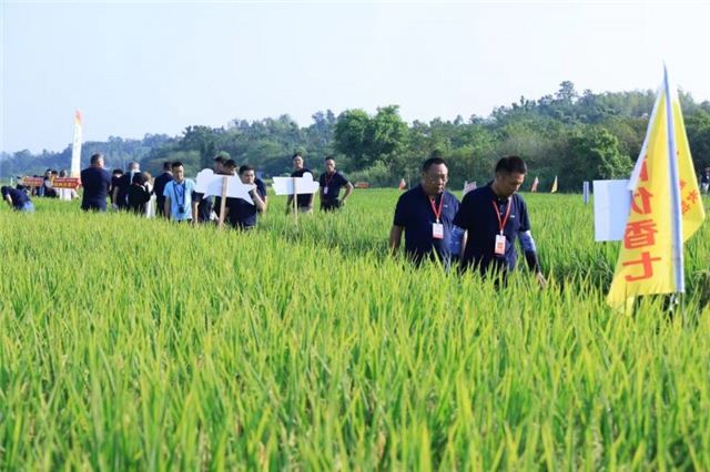经过精心培育和管理,湖南碧盈泰米超级稻终于迎来了丰收的季节。9月,种业公司在这里召开了全国商户的现场观摩会,超级稻的优异表现赢得了广泛赞誉。这不仅为戴公桥村明年的粮食安全奠定了坚实基础,也为种粮大户们树立了一个崭新的标杆。