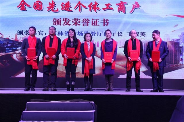 联欢会上,吉林省市场监督管理厅副厅长王淑英为王力辉、翟丽青等7位“全国先进个体工商户”和“全国先进工作者”颁发荣誉证书。