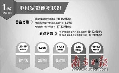 近日发布的第19期《中国宽带速率状况报告》(2018年第一季度)显示,我国固定宽带和4G网络平均下载速率已处于20Mbit/s水平线上下,下载速率又达到新台阶。
