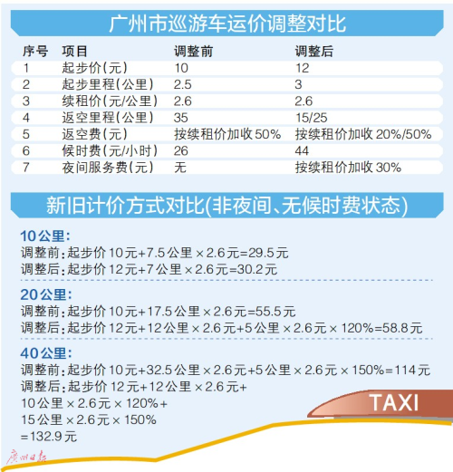 据广州市发改委有关负责人介绍,出租车运价结构方面:一是起步价从10元/2.5公里调整为12元/3公里;二是候时费由26元/小时调整为44元/小时;三是返空费由原来35公里返空里程加收续租价50%调整为实行阶梯附加收费,其中,15公里至25公里按续租价加收20%,25公里以上按续租价加收50%;四是增设夜间服务费,按续租价加收30%。
