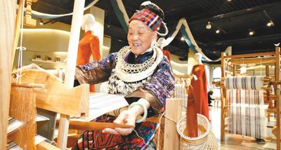 图为5月22日,苗族艺人在丰台园博园向观众演示传统织布技艺。