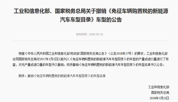 今年4月,工业和信息化部、财政部和国家税务总局联合发布公告,表示将进一步加强对《免征车辆购置税的新能源汽车车型目录》的管理,建立健全动态管理机制。公告中指出,对2017年1月1日以前列入《目录》后截至此公告发布之日无产量或进口量的车型、2017年1月1日及以后列入《目录》后12个月内无产量或进口量的车型,公示5个工作日无异议后将从《目录》中撤销。