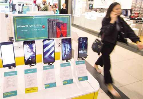 5月17日,在加拿大多伦多伊顿购物中心,一名女子从销售商展示的华为P20系列智能手机旁经过。