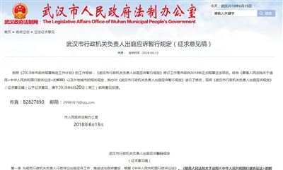 6月13日,武汉市政府法制办通过其官方网站,发布新版《武汉市行政机关负责人出庭应诉暂行规定》(下称《规定》),对2015年4月30日发布的旧版《规定》进行修改。修改主要集中在对于行政机关负责人出庭应诉的条件、要求以及追责等方面。