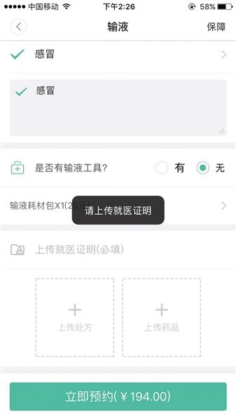 某“共享护士”平台要求预约时提供就医证明,但记者提供虚假资料也能通过审核。 手机截图