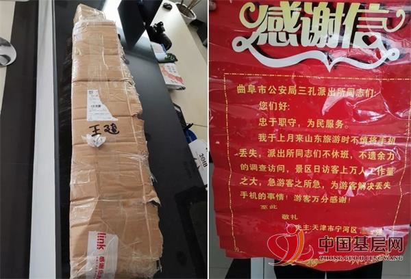 据了解,2018年6月30日,三孔派出所接到报警,称一位天津的游客来三孔景区旅游,不慎将自己的金立8848手机丢失。民警详细了解情况后,放弃自己的休息时间,通过各种渠道查询并及时与景区工作人员联系,终于找到了丢失的8848手机。这位天津游客回家后定制了一面锦旗并写了一封感谢信邮寄到三孔所对民警的热心帮助表示感谢。
