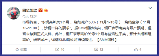 市场传言,“永钢高炉关1个月, 烧结减产50%(11月1-15号) 烧结全停(11月16-11.30),沙钢一样的要求”。据SMM钢铁核实,钢厂表示确实有限产预期,但暂未接到正式文件。此外,钢厂表示高炉关停1个月有些言过于实,预计大概率是高炉、烧结减产,详情SMM钢铁将持续跟进。【SMM钢铁】