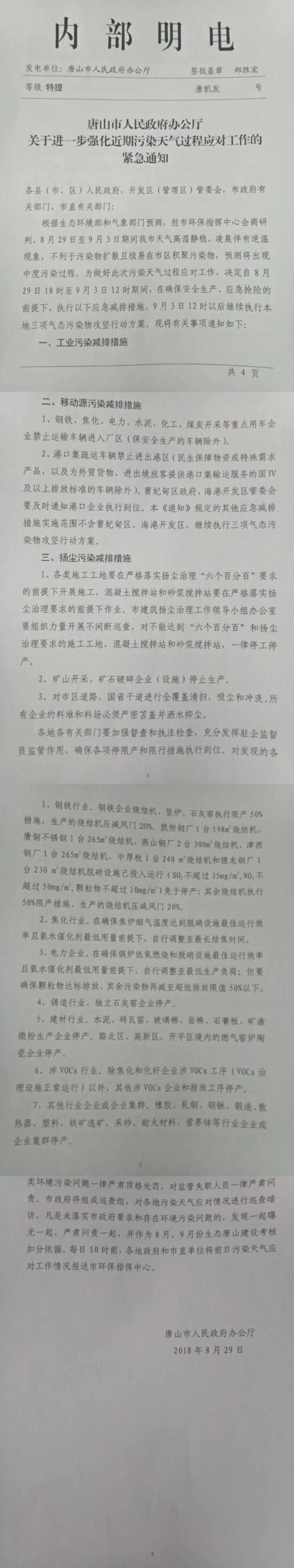 唐山市人民政府办公厅 关于进一步强化近期污染天气过程应对工作的 紧急通知 各县(市、区)人民政府,开发区(管理区)管委会,市政府有 关部门,市直有关部门根据生态环境部和气象部门预测,经市环保指挥中心会商研判,8月29日至9月3日期间我市天气高湿静稳,凌晨伴有逆温现象,不利于污染物扩散且极易在市区积聚污染物,预测将出现中度污染过程,为做好此次污染天气过程应对工作,决定自8月 29日18时至9月3日12时期间,在确保安全生产,应急抢险的前提下,执行以下应急减排措施,9月3日12时以后继续执行本 地三项气态污染物攻坚行动方案。现将有关事项通知如下: