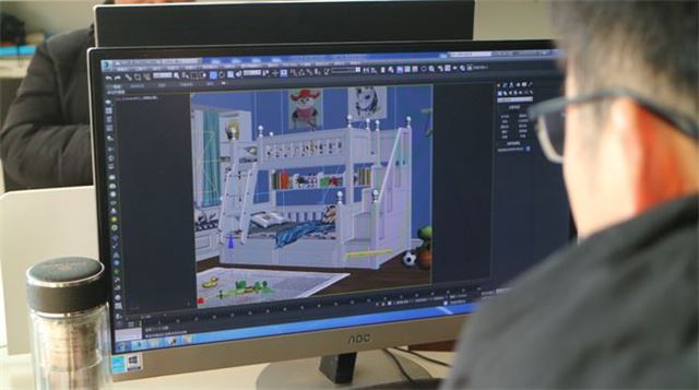 图说:江苏睢宁县沙集电商创业园内, 3D制图师正设计一张子母床展示图
