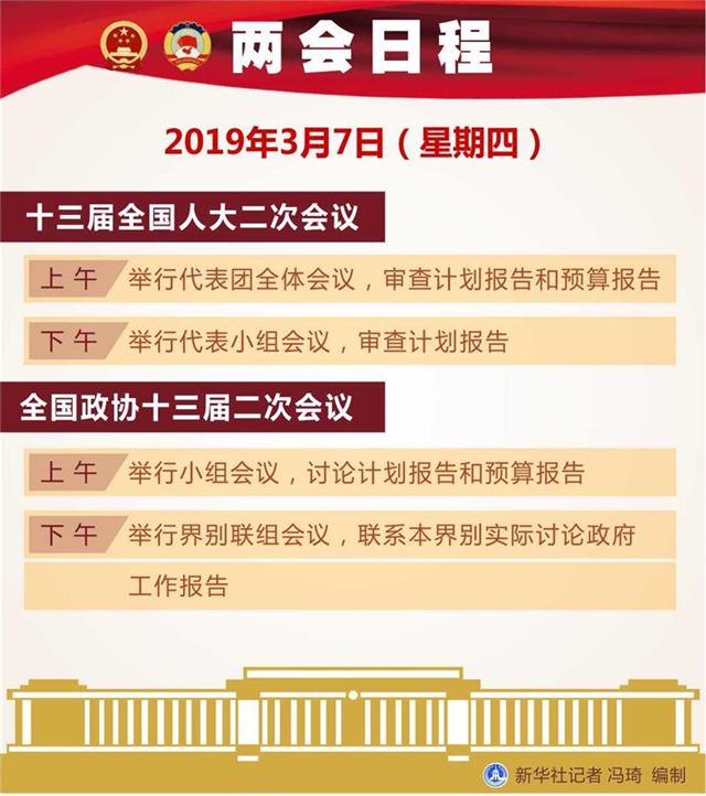 新华社北京3月6日电 十三届全国人大二次会议7日上午举行代表团全体会议,审查计划报告和预算报告;下午举行代表小组会议,审查计划报告。