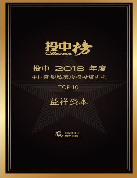 近日,益祥资本凭借专业、优秀的投资业绩,荣获投中榜“2018年度中国新锐私募股权投资机构TOP10”荣誉。