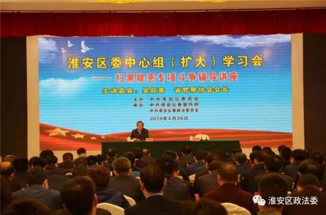 为深入贯彻落实党中央、国务院关于开展扫黑除恶专项斗争要求和省、市扫黑除恶专项斗争专题会议精神,进一步提高政治站位,调动各方力量,将全区扫黑除恶专项斗争不断向纵深推进,切实做好迎接中央扫黑除恶督导组来淮督导准备工作,4月26日,江苏淮安区委中心组(扩大)举行学习会,专题学习扫黑除恶专项斗争知识。徐子佳、施恩佩、蒋必海、关晓卫、张建闯、宋建国、许国忠、吴洪刚等区领导参加会议。