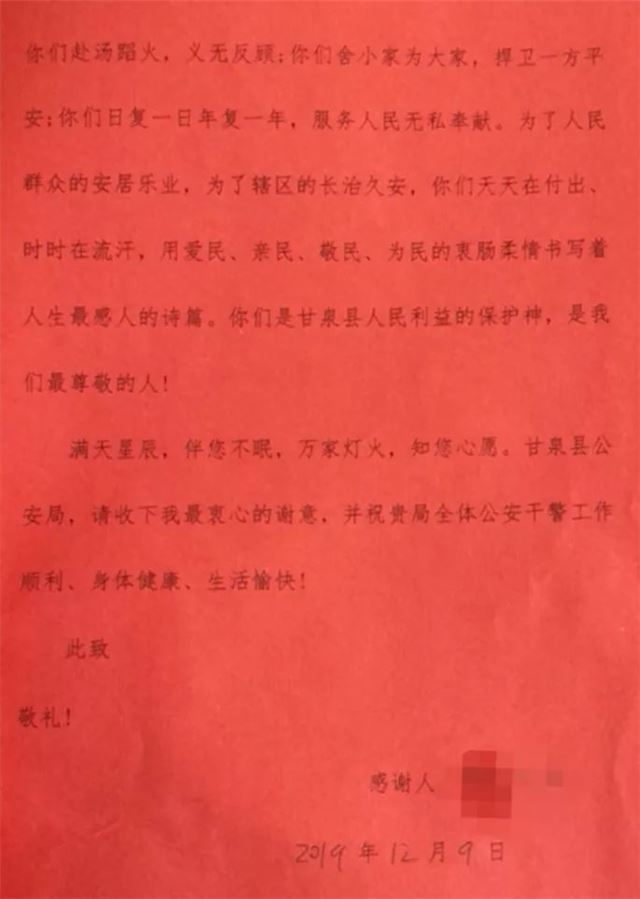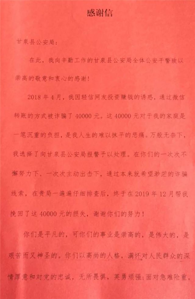 本来不报任何希望的被害人王某激动的说:“我知道电信诈骗案子非常难破,但是甘泉警察不畏艰难险阻,为了群众利益废寝忘食,非常感谢你们为我挽回损失”,同时向我局送来了锦旗和感谢信。