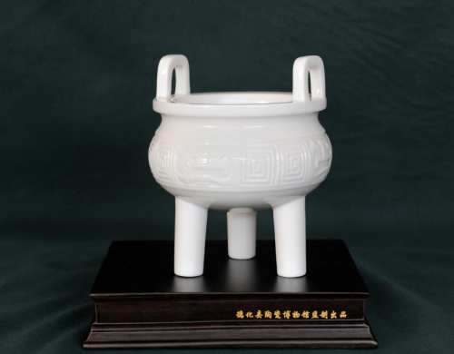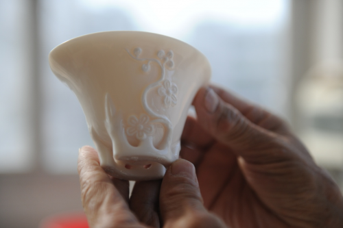 在李建水工作室,我们看到的不仅有观音、弥勒、妈祖等传统佛造像,也有复原明代的孩儿红、象牙白梅花杯和回纹三足炉等器形类作品,还有百福杯、心经杯、不忘初心杯等适应当下人的茶器类作品。不管哪一类作品,都有一个共同的特点,就是具备德化白瓷独特的材质与色泽,呈现出暖色温润的特性,同时会有负离子产生,使用时更加养生健康。“孩儿红”的白瓷在光线的透视下显露出淡淡的红色,“猪油白” 则体现出白瓷油脂般的质感。李建水介绍说,德化白瓷俗称“糯米胎”,带有晶莹的光泽,釉水洁净匀厚与胎骨结合紧密浑然一体,呈色温润如玉,剔透光滑,器体在光线照耀下,可映见指影。在与李建水闲聊间,他时常会拿出早年从古窑址捡回来的“孩儿红”“象牙白”等古瓷片,与如今自己烧制出来的作品进行比对,不时露出满意的笑容。