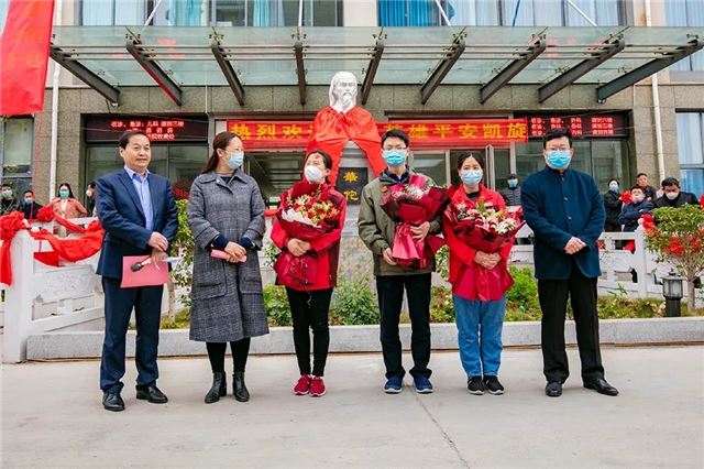当车门开启,我院丁锋、韩华秋、周慧芳等3位英雄带着胜利的笑容、回家的幸福走下车,挥手向等待已久的家乡人民挥手致意,在场人员以热烈掌声,向他们表达敬意和祝福。
