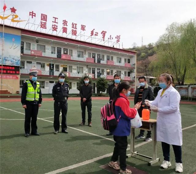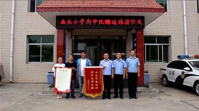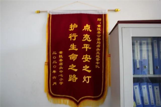 6月28日下午,黄陵县店头镇红军小学将一面写着“点亮平安之灯 护行生命之路”的锦旗送到黄陵县公安局交警大队店头中队,对中队多年来坚守“护学岗”,守护学校师生的交通安全表示由衷的感谢。