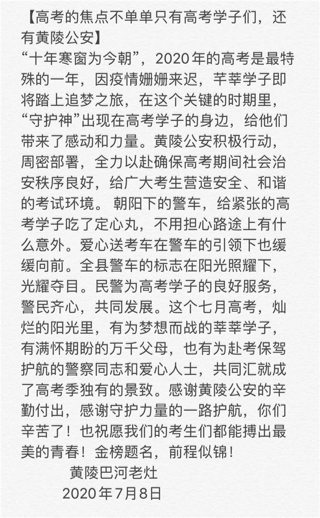 7月8日一大早,爱心企业”黄陵巴河老灶“就为黄陵公安高考执勤点的执勤的民辅警送来了30箱矿泉水,并送上了一封电子感谢信,感谢黄陵公安人全力护航高考。