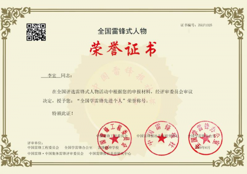 2020年6月,李宏同志荣获由中国雷锋工程委员会、中国雷锋报社、全国学雷锋办公室、中国雷锋报社美育研究中心、中国雷锋·中国集体雷锋评审委员会授予“全国学雷锋先进个人”荣誉称号,这是对李宏同志热心公益事业,积极参与社会志愿服务工作,无私奉献精神的肯定及认可。
