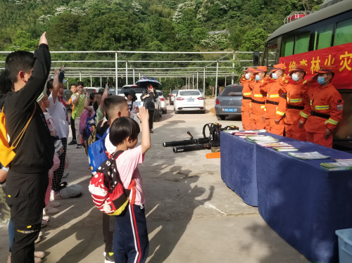 突然一群小朋友在家长的引导下向正在执勤的森林消防指战员敬礼,大声说道:“消防员叔叔,你们辛苦了!”。消防员立刻敬礼致谢。