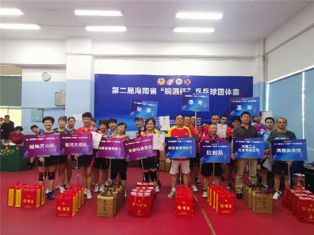 海南大学、海南铁路、海航控股、华能电力、南方电网、邮储银行等二十多家业余乒乓球俱乐部以及安徽皖酒集团、海南蚌埠商会共34支劲旅踊跃参赛。比赛共设男子、女子团体2个项目。男子团体20个队,女子团体14个队,领队、教练员、运动员、裁判员以及工作人员总人数近300人。经过两天紧张激烈的角逐,今天下午圆满结束。海鹰俱乐部、安徽皖酒集团分别夺得男子、女子团体冠军。利伟代表安徽皖酒集团向获得男子、女子团体前8名的运动队分别颁发荣誉证书和奖品;向所有参赛运动员颁发参与奖。