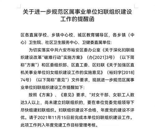按照《裕安区关于深化妇联组织建设改革“破难行动”实施方案》和《裕安区关于加强区直机关、事业单位妇联组织建设工作的实施意见》文件要求,“对女干部、女职工人数达3人以上,尚未建立妇联的单位,要在单位党组(委)领导下尽快按照组织程序成立妇联;因妇女人数不足3人不能成立妇联的,可几个单位成立联合妇联”;文件还明确,妇建不合格,党建不评优。
