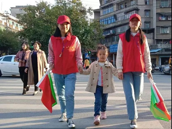 图为劝导员护送低年级学生安全横过斑马线。