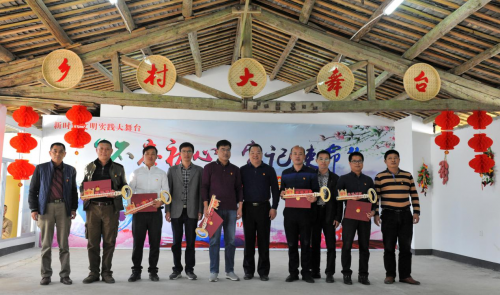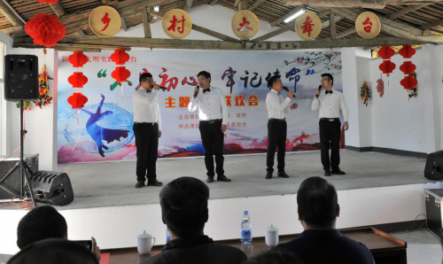 铭爱村“乡村大舞台”文艺演出现场精彩不断,高潮迭起,《不忘初心》《故乡的云》《红旗飘飘》等一首首耳熟能详的歌曲,突出新时代主旋律,经演员们倾情演唱,展现了新时代镇村干群建功立业、奋发有为的良好精神风貌和高昂的工作热情,由镇村干部职工自编自演的诗朗诵《中华颂——走进赤水》激情澎湃,气势磅礴。现场还表彰了钱泾、杨延平、孙锦延、黄唐嘉、黄活虎等五位省、市、县派驻赤水的优秀驻村干部,他们在脱贫攻坚一线,勤勤恳恳,为当地村民,为赤水镇的脱贫攻坚做出了突出贡献,该镇党委政府授予五位优秀驻村干部“赤水镇荣誉居民”称号,并颁发寓意着打开心灵大门的钥匙。最后全场干部群众一同深情歌唱《我和我的祖国》,将文艺演出推向了高潮。