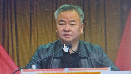 图为县委书记蒋伟在脱贫攻坚讲评会上讲话。。