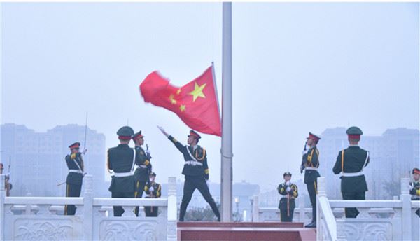 升旗仪式上,十二名国旗护卫队同学护卫国旗走向升旗台,在激昂的国歌声中,鲜艳的五星红旗缓缓升起,在全体师生的注目中,迎着初升的朝阳,在晨曦中迎风飘扬。