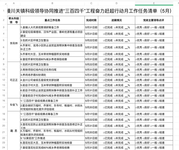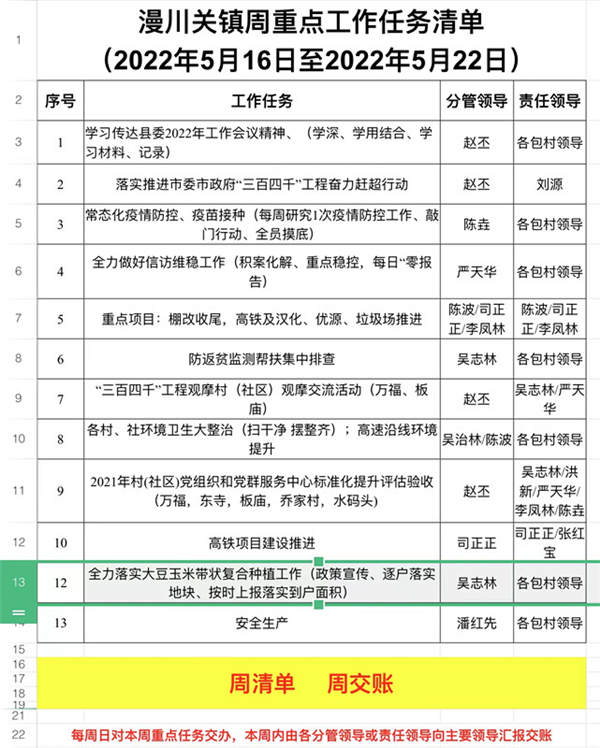 编制一张清单,做到“人人清”。按照“每周一清单、每周一交账、每周一排名、每周一通报、每月一清单、每月一排名、每月一通报点评”的方式,扎实推进“三百四千”工程奋力赶超行动,确保高质量完成各项工作任务。