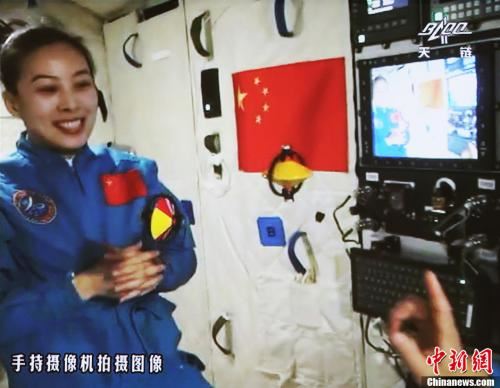 资料图:2013年6月20日10时许,神舟十号航天员在天宫一号开展基础物理实验,为青少年进行中国首次太空授课。图为王亚平讲授太空失重提供条件下的陀螺演示。中新社发 秦宪安 摄