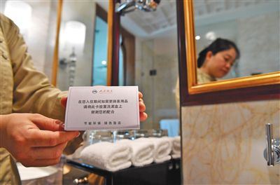 在多家酒店客房内,记者都看到一张绿色小卡片,上面注明:如果需要更换床单、被套等物品,请将绿色卡片放置在床上。