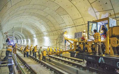12日上午,在北京北站外的京张高铁清华园隧道进口,最后一组500米长钢轨落位,京张高铁全线铺轨完成,为今年9月联调联试和年底开通运营奠定了重要基础(见图,本报记者史家民摄)。