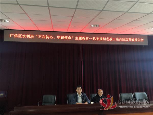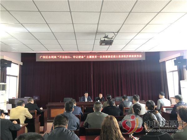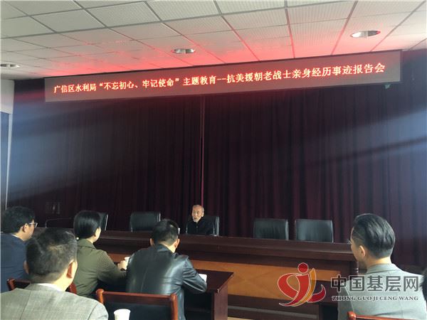 10月29日上午,上饶市广信区水利局在局三楼会议室召开“不忘初心、牢记使命”主题教育暨抗美援朝老战士龚水源亲身经历事迹报告会,区水利局党组书记、局长周元锋主持会议。区主题教育第六巡回指导组郑银燕组长、龚逸晨副组长到会指导,局班子成员及全体党员干部参加,共计50余人参加会议。