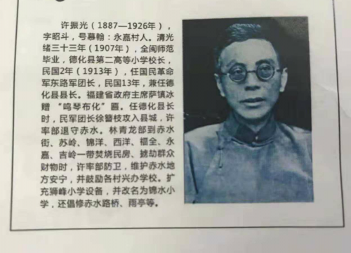 据介绍,许振光1887年生于永嘉村书香门第,清光绪三十三年(1907年),毕业于全闽师范学校,父亲凭借赤水商会及衙门的关系,联合几位商人在赤水的狮峰山腰创办德化县第二高等小学,推举许振光任校长。民国元年(1912年)春的一天,负责招收学生的一位老师将学生花名册及缴纳学费的账单送到许振光办公室让他签批。和往常一样,许振光先审名册后审账单。结果发现学费额数与学生人数不对等,便问其故。这位老师说:其一是破格收了九位女生,每人多收一块银元,原因是“自古女人不登堂”,既是破格接收就得多收学费;其二,有一位把总(当时赤水驻军组织仍续清代叫“汛地”,把总是汛地长官,相当于现在的驻军营长)及二位校董的孙子没交学费,原因是校园的安全得靠他们罩着,孙子上学没交学费校方不好摧讨。许振光听后,沉思了一会,突然大拍桌子吼道:“王爷国公也不例外!”吓得那位老师扔下账单就跑。