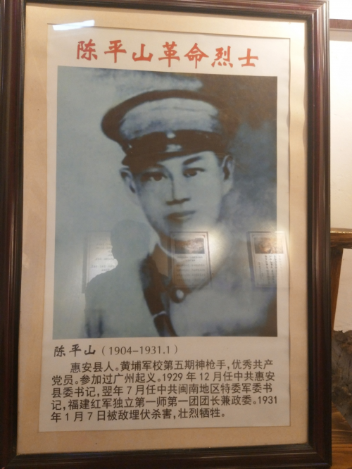 (老记者陈辉生报道)金秋九月,秋风送爽。近日的一天上午,记者驱车来到福建省泉州市泉港区樟脚村犁壁岭自然村,在朋友惠安“由名堂”创始人蒋伟彬的引路下,沿着村口小道走向大山深处的陈平山故居。一路上,蒋伟彬滔滔不绝地向记者介绍了革命烈士、原惠安暴动领导人之一陈平山生前的光辉事迹,他说,今年是革命者陈平山牺牲89周年,又是惠安解放71周年。我们跨过小溪,踏着一级级石阶,再穿过一片森林,石阶而上,一排由石头混凝土建造而成的古民居立刻映入了记者的眼帘,鲜红的“陈平山故居”五个字显得格外耀眼。据介绍,陈平山是大革命时期优秀的中国共产党党员。他早年就读于惠安实化学校,毕业于黄埔军校第五期,参加过广州起义;曾任中共泉州市特委军委书记、福建红军惠安总指挥部总指挥、福建红军独立一师第一团团长兼政委等职务,参与组织和领导过震撼八闽的惠安暴动。暴动失利后,陈平山坚持地下斗争,在惠安、仙游、晋江交界的三坪地区开辟根据地,1931年1月7日,陈平山遭国民党反动派暗杀,英勇牺牲,年仅26岁。蒋伟彬介绍说,为了纪念陈平山,樟脚人就把这条路叫平山路。陈平山故居旧址重修前破坏不堪,杂草丛生,4年前当地政府部门启动修缮工作,经过近一年时间才修缮完毕,同时对外开放。当记者走进陈平山故居时,望着一幅幅红色图片展、惠安暴动史、红军战士遗物手迹、红色图书……,不禁心潮起伏,仿佛看到了当年在那炮火纷飞的峥嵘岁月里,革命先烈前仆后继、奋勇杀敌的身影,正是他们用自己的鲜血染红了战旗,用宝贵的青春和生命谱写了壮丽的篇章。
