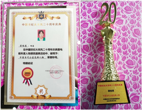 传播时代精神,展现中国风采。2020年8月29日-30日,中国世纪大采风二十周年庆典活动在北京大兴星光影视基地演播大厅隆重举行,来自全国各地在各行业做出突出贡献的行业精英们齐聚一堂,交流展现自己的精彩人生、行业经验,以及近十年来快速发展和长足进步。活动期间,江苏省宜兴市张渚镇红十字会常务理事蒋桂英参加了此次盛会,并荣获“中国当代公益先锋人物”荣誉称号。