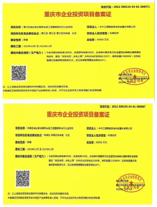 深入学习贯彻党的十九届五中全会精神,推动社会治理重心向基层下移,把更多资源、服务、管理放到社区,为社区居民提供精准化、精细化服务等相关政策。2020年12月4日,中升乙源颐居养老科技重庆有限公司,重庆市“城企联动颐养安居工程暨颐养出行公益项目”,在重庆市荣昌区、綦江区等六地发展和改革委员会成功备案,为老旧楼加装电梯,改造原有旧电梯,在电梯井道及单元对应屋顶安装碲化镉玻璃发电组件,建设“自发自用、余电上网”分布式光伏发电站,在各街道通过免费获取或租赁方式,设立电梯管理暨助老驿站。