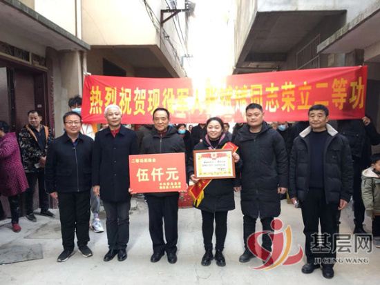 2021年2月5日上午,临泉县城东街道办事处主任王春吾、武装部长单德强与县现役军人事务局有关负责同志等一行为光明社区为荣立二等功的现役军人张斌斌的家人送去喜报、证书和奖金。