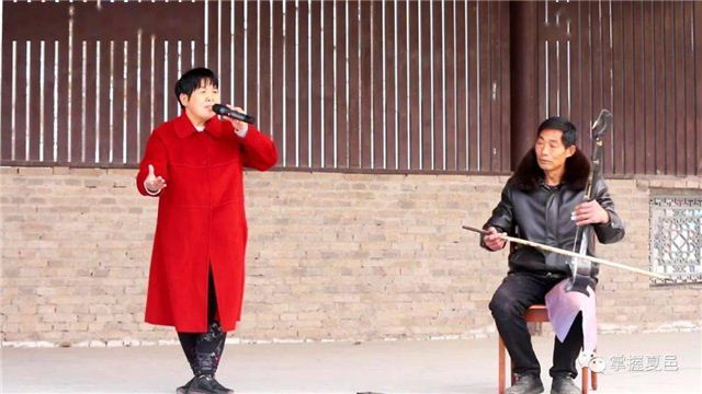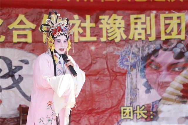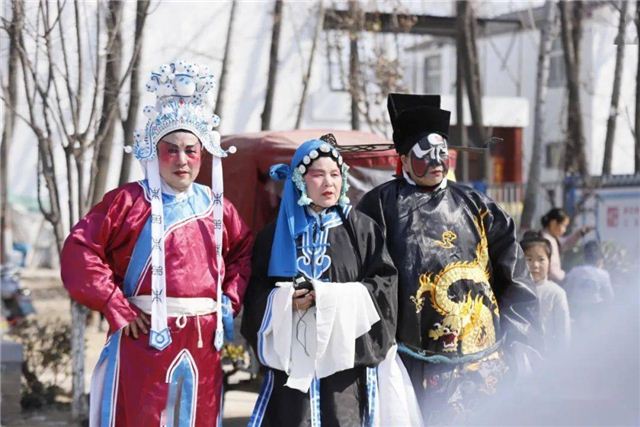 文化休闲广场上,村民正在体育健身器材上活动,花戏楼上还有百姓在唱着戏曲,一片和谐美好景象。